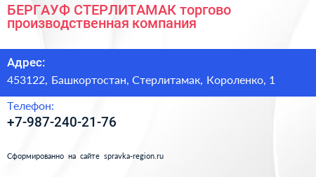 БЕРГАУФ СТЕРЛИТАМАК, торгово-производственная компания по адресу 453122, Башкортостан, Стерлитамак, Короленко, 1 в дальнейшем Организация, размещена в следующих категориях: