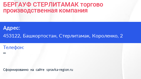 БЕРГАУФ СТЕРЛИТАМАК, торгово-производственная компания по адресу 453122, Башкортостан, Стерлитамак, Короленко, 2 в дальнейшем Организация, размещена в следующих категориях: