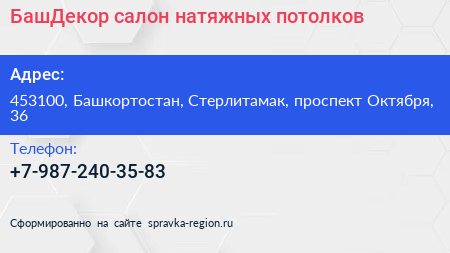 БашДекор, салон натяжных потолков по адресу 453100, Башкортостан, Стерлитамак, проспект Октября, 36 в дальнейшем Организация, размещена в следующих категориях: