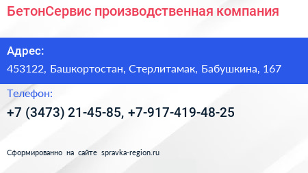 БетонСервис, производственная компания по адресу 453122, Башкортостан, Стерлитамак, Бабушкина, 167 в дальнейшем Организация, размещена в следующих категориях: