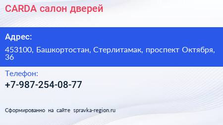 CARDA, салон дверей по адресу 453100, Башкортостан, Стерлитамак, проспект Октября, 36 в дальнейшем Организация, размещена в следующих категориях:
