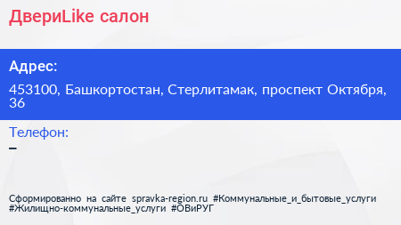 ДвериLike, салон по адресу 453100, Башкортостан, Стерлитамак, проспект Октября, 36 в дальнейшем Организация, размещена в следующих категориях: