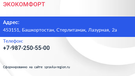 ЭКОКОМФОРТ по адресу 453151, Башкортостан, Стерлитамак, Лазурная, 2а в дальнейшем Организация, размещена в следующих категориях: