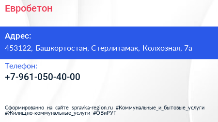 Евробетон по адресу 453122, Башкортостан, Стерлитамак, Колхозная, 7а в дальнейшем Организация, размещена в следующих категориях: