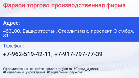 Фараон, торгово-производственная фирма по адресу 453100, Башкортостан, Стерлитамак, проспект Октября, 81 в дальнейшем Организация, размещена в следующих категориях: