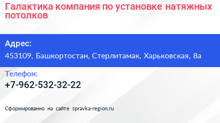Галактика, компания по установке натяжных потолков по адресу 453109, Башкортостан, Стерлитамак, Харьковская, 8а в дальнейшем Организация, размещена в следующих категориях: