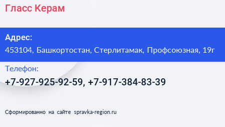 Гласс Керам по адресу 453104, Башкортостан, Стерлитамак, Профсоюзная, 19г в дальнейшем Организация, размещена в следующих категориях: