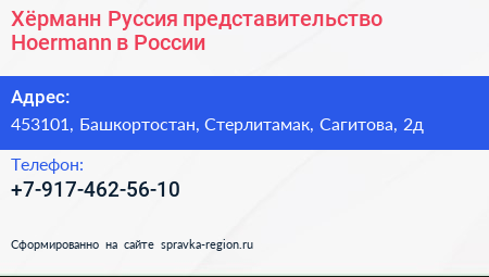 Хёрманн Руссия, представительство Hoermann в России по адресу 453101, Башкортостан, Стерлитамак, Сагитова, 2д в дальнейшем Организация, размещена в следующих категориях: