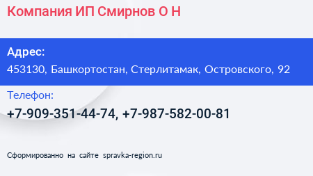 Компания, ИП Смирнов О.Н. по адресу 453130, Башкортостан, Стерлитамак, Островского, 92 в дальнейшем Организация, размещена в следующих категориях: