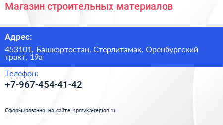 Магазин строительных материалов по адресу 453101, Башкортостан, Стерлитамак, Оренбургский тракт, 19а в дальнейшем Организация, размещена в следующих категориях:
