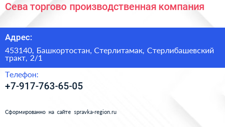 Сева, торгово-производственная компания по адресу 453140, Башкортостан, Стерлитамак, Стерлибашевский тракт, 2/1 в дальнейшем Организация, размещена в следующих категориях:
