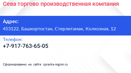 Сева, торгово-производственная компания по адресу 453122, Башкортостан, Стерлитамак, Колхозная, 12 в дальнейшем Организация, размещена в следующих категориях: