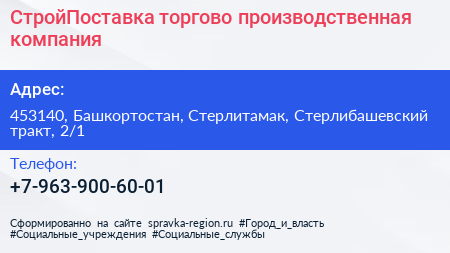 СтройПоставка, торгово-производственная компания по адресу 453140, Башкортостан, Стерлитамак, Стерлибашевский тракт, 2/1 в дальнейшем Организация, размещена в следующих категориях: