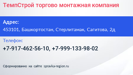 ТемпСтрой, торгово-монтажная компания по адресу 453101, Башкортостан, Стерлитамак, Сагитова, 2д в дальнейшем Организация, размещена в следующих категориях: