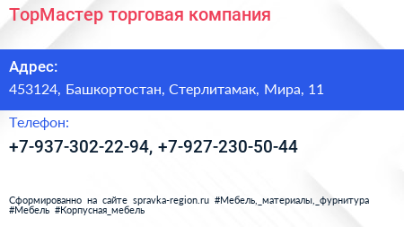 ТорМастер, торговая компания по адресу 453124, Башкортостан, Стерлитамак, Мира, 11 в дальнейшем Организация, размещена в следующих категориях:
