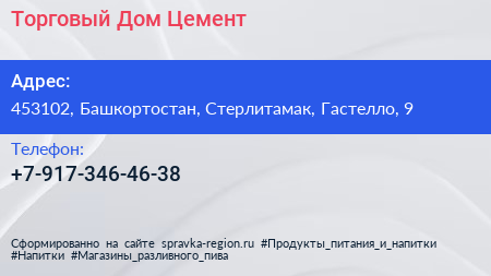 Торговый Дом Цемент по адресу 453102, Башкортостан, Стерлитамак, Гастелло, 9 в дальнейшем Организация, размещена в следующих категориях: