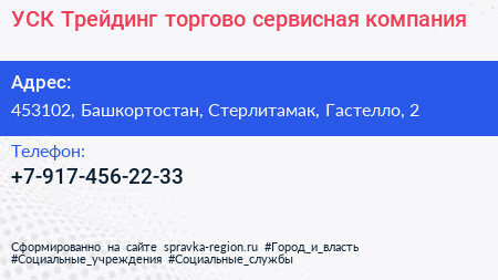 УСК-Трейдинг, торгово-сервисная компания по адресу 453102, Башкортостан, Стерлитамак, Гастелло, 2 в дальнейшем Организация, размещена в следующих категориях: