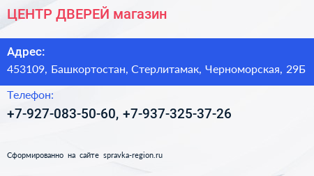 ЦЕНТР ДВЕРЕЙ, магазин по адресу 453109, Башкортостан, Стерлитамак, Черноморская, 29Б в дальнейшем Организация, размещена в следующих категориях: