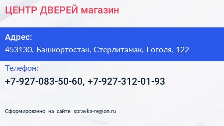 ЦЕНТР ДВЕРЕЙ, магазин по адресу 453130, Башкортостан, Стерлитамак, Гоголя, 122 в дальнейшем Организация, размещена в следующих категориях: