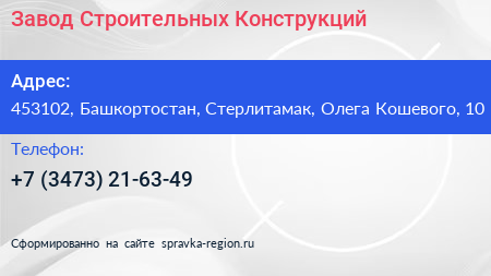 Завод Строительных Конструкций по адресу 453102, Башкортостан, Стерлитамак, Олега Кошевого, 10 в дальнейшем Организация, размещена в следующих категориях:
