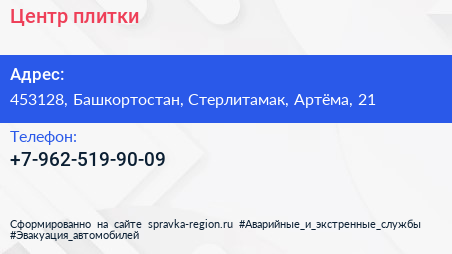 Центр плитки по адресу 453128, Башкортостан, Стерлитамак, Артёма, 21 в дальнейшем Организация, размещена в следующих категориях: