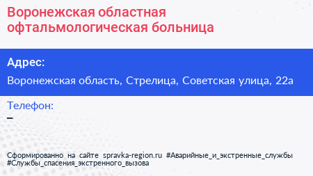Воронежская областная офтальмологическая больница по адресу Воронежская область, Стрелица, Советская улица, 22а в дальнейшем Организация, размещена в следующих категориях: