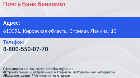 Почта Банк, банкомат по адресу 610051, Кировская область, Стрижи, Ленина, 10 в дальнейшем Организация, размещена в следующих категориях: