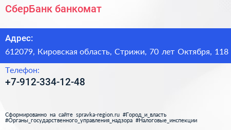 СберБанк, банкомат по адресу 612079, Кировская область, Стрижи, 70 лет Октября, 118 в дальнейшем Организация, размещена в следующих категориях: