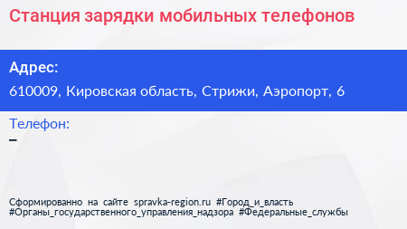 Станция зарядки мобильных телефонов по адресу 610009, Кировская область, Стрижи, Аэропорт, 6 в дальнейшем Организация, размещена в следующих категориях:
