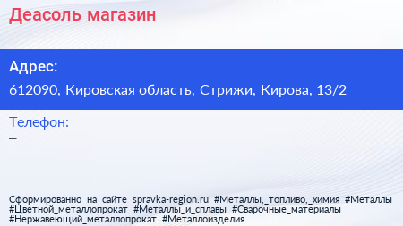 Деасоль, магазин по адресу 612090, Кировская область, Стрижи, Кирова, 13/2 в дальнейшем Организация, размещена в следующих категориях: