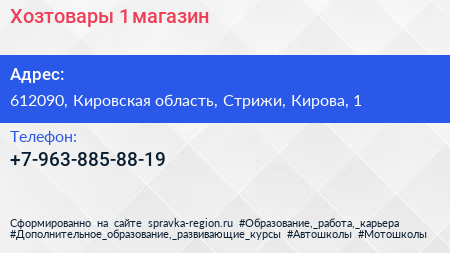 Хозтовары №1, магазин по адресу 612090, Кировская область, Стрижи, Кирова, 1 в дальнейшем Организация, размещена в следующих категориях: