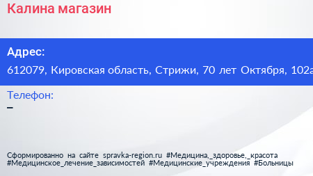 Калина, магазин по адресу 612079, Кировская область, Стрижи, 70 лет Октября, 102а в дальнейшем Организация, размещена в следующих категориях: