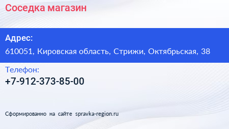 Соседка, магазин по адресу 610051, Кировская область, Стрижи, Октябрьская, 38 в дальнейшем Организация, размещена в следующих категориях: