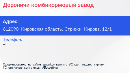 Дороничи, комбикормовый завод по адресу 612090, Кировская область, Стрижи, Кирова, 12/1 в дальнейшем Организация, размещена в следующих категориях: