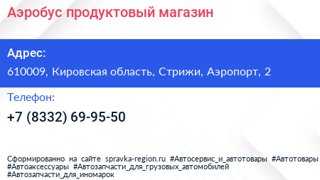 Аэробус, продуктовый магазин по адресу 610009, Кировская область, Стрижи, Аэропорт, 2 в дальнейшем Организация, размещена в следующих категориях:
