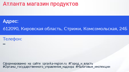 Атланта, магазин продуктов по адресу 612090, Кировская область, Стрижи, Комсомольская, 24Б в дальнейшем Организация, размещена в следующих категориях: