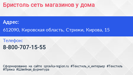 Бристоль, сеть магазинов у дома по адресу 612090, Кировская область, Стрижи, Кирова, 15 в дальнейшем Организация, размещена в следующих категориях: