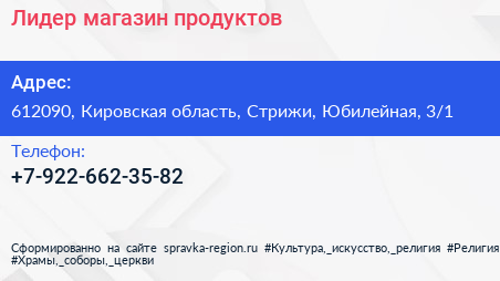 Лидер, магазин продуктов по адресу 612090, Кировская область, Стрижи, Юбилейная, 3/1 в дальнейшем Организация, размещена в следующих категориях: