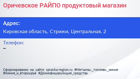 Оричевское РАЙПО, продуктовый магазин по адресу Кировская область, Стрижи, Центральная, 2 в дальнейшем Организация, размещена в следующих категориях: