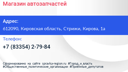Магазин автозапчастей по адресу 612090, Кировская область, Стрижи, Кирова, 1а в дальнейшем Организация, размещена в следующих категориях: