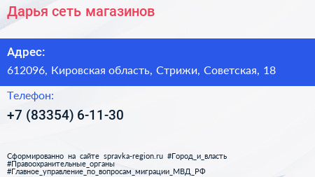 Дарья, сеть магазинов по адресу 612096, Кировская область, Стрижи, Советская, 18 в дальнейшем Организация, размещена в следующих категориях: