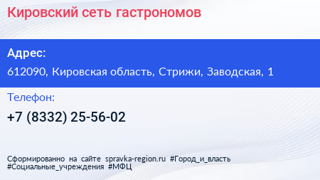 Кировский, сеть гастрономов по адресу 612090, Кировская область, Стрижи, Заводская, 1 в дальнейшем Организация, размещена в следующих категориях: