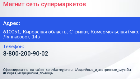 Магнит, сеть супермаркетов по адресу 610051, Кировская область, Стрижи, Комсомольская (мкр. Лянгасово), 14в в дальнейшем Организация, размещена в следующих категориях: