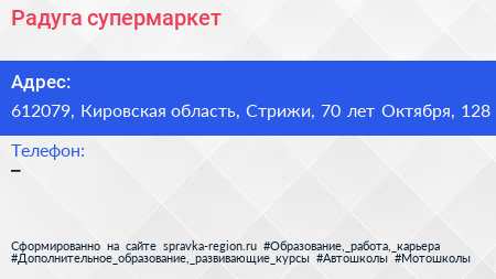 Радуга, супермаркет по адресу 612079, Кировская область, Стрижи, 70 лет Октября, 128 в дальнейшем Организация, размещена в следующих категориях: