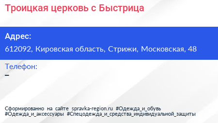 Троицкая церковь, с. Быстрица по адресу 612092, Кировская область, Стрижи, Московская, 48 в дальнейшем Организация, размещена в следующих категориях: