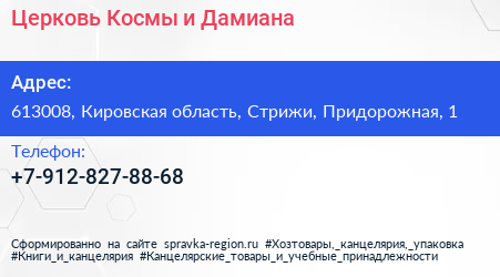 Церковь Космы и Дамиана по адресу 613008, Кировская область, Стрижи, Придорожная, 1 в дальнейшем Организация, размещена в следующих категориях: