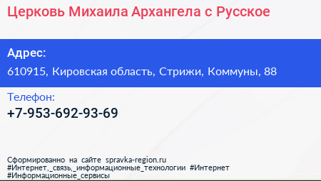 Церковь Михаила Архангела, с. Русское по адресу 610915, Кировская область, Стрижи, Коммуны, 88 в дальнейшем Организация, размещена в следующих категориях: