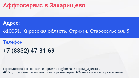 Аффтосервис в Захарищево по адресу 610051, Кировская область, Стрижи, Старосельская, 5 в дальнейшем Организация, размещена в следующих категориях: