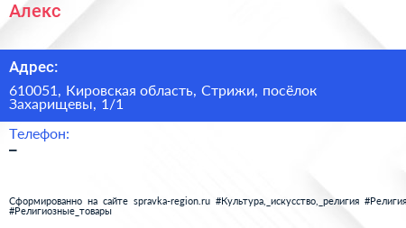 Алекс по адресу 610051, Кировская область, Стрижи, посёлок Захарищевы, 1/1 в дальнейшем Организация, размещена в следующих категориях: