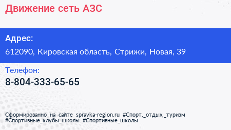 Движение, сеть АЗС по адресу 612090, Кировская область, Стрижи, Новая, 39 в дальнейшем Организация, размещена в следующих категориях: